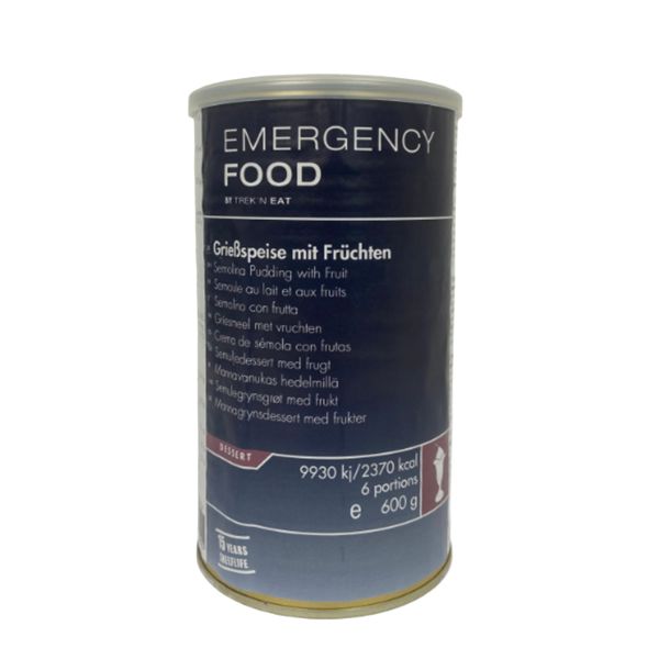 Kasza manna z mlekiem i owocami Emergency Food firmy Trek'n Eat to energetyczny deser stworzony z myślą o długoterminowych zapasach żywności. Dzięki trwałości sięgającej 15 lat stanowi niezawodne rozwiązanie dla rezerw awaryjnych, dalekich wypraw lub sytuacji wymagających długotrwałej autonomii żywieniowej.